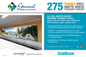 GF 275 SubMark von General Formulations ist eine flexible, polymere, mattweiße, opake Vinylfolie, die mit einem speziellen, transparenten, lösemittelbasierten, permanenten High-Tack Klebstoff mit sehr hoher Klebkraft beschichtet ist, der ursprünglich für den Wandausschnitt von ...