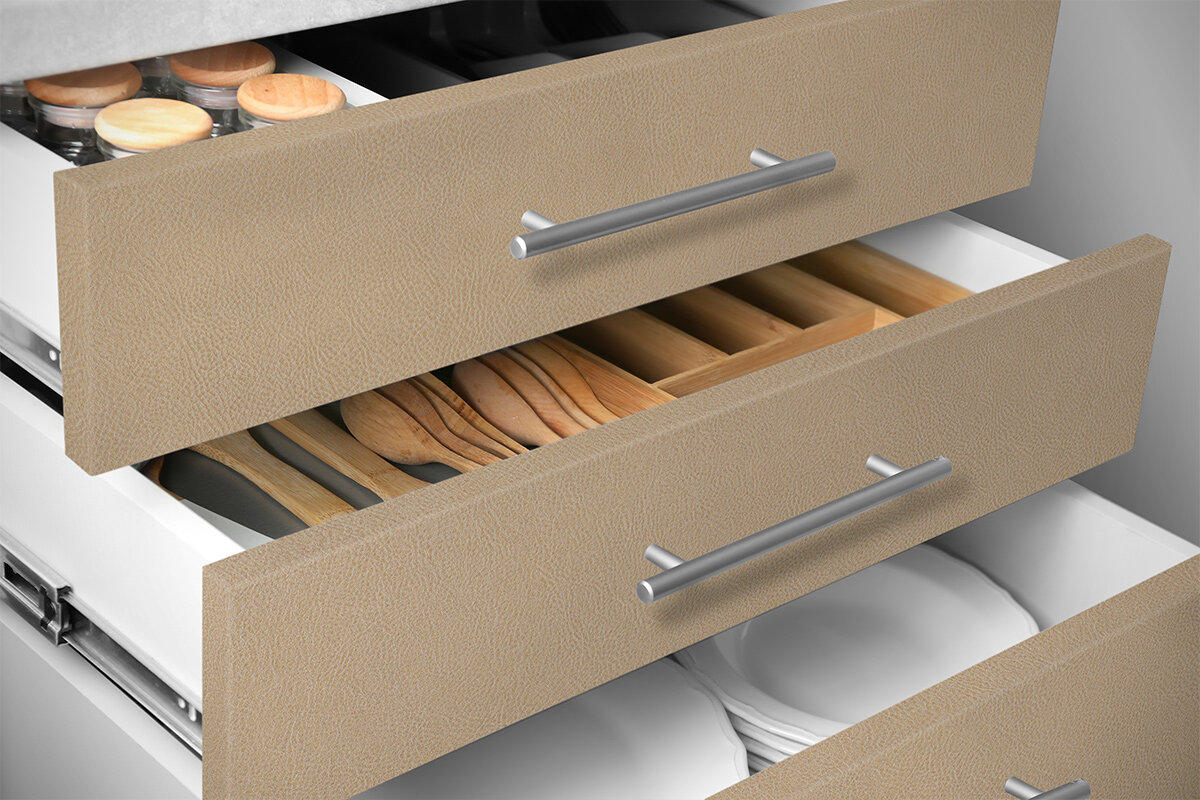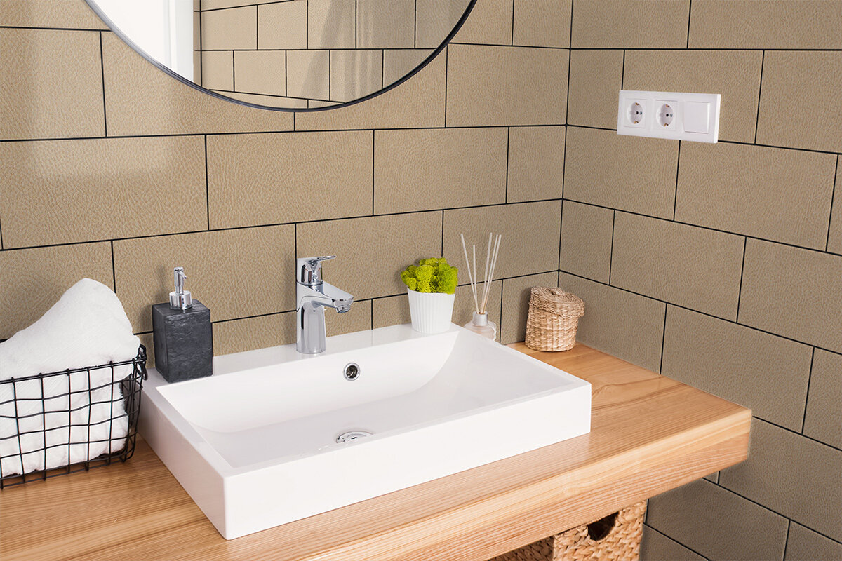 Bodaq TNS04 Camel Grained Leather ist eine robuste, 400 µm starke, verformbare Interiorfolie in genarbter Lederoptik mit fühlbarer Haptik, mit der man durch Upcycling nicht nur die Umwelt schont, sondern auch Kosten spart, Zeit reduziert und nebenbei optische Akzente in Hotellerie, Gastronomie, Shops, Ladenbau oder Wohnräumen setzt. Bereits vorhandene natürliche Rohstoffe, wie z. B. Türen, Fenster, Fensterbänke, Fliesen, Treppen, Möbel usw., können umweltschonend wiederverwertet werden und schonen unsere Wälder und vermeiden Müll. Die PVC-Folie ist in mehreren Schichten aufgebaut und mit einem positionierbaren Luftkanalklebstoff für blasen- und faltenfreie Verklebungen ausgestattet. Der Schutzfilm auf der Folienoberfläche ist wasserresistent, schmutzabweisend, temperaturbeständig, strapazierfähig und pflegeleicht mit hoher Resistenz gegen viele Flüssigkeiten. Außerdem wirkt er antibakteriell und reduziert die Ansiedlung und Vermehrung von Mikroorganismen, was in Nassräumen ein besonders erwünschter Effekt ist. Die Folie ist frei von Phthalaten (Weichmachern) und schädlichen Schwermetallen, wie Blei oder Quecksilber, und wird mithilfe erneuerbarer Energien hergestellt. Von Beginn der Produktion bis zum fertigen Produkt sind alle CO² Emissionen erfasst und kontrolliert. Die Folie besitzt ein Brandschutzzertifikat B1 nach DIN 4102-1.
