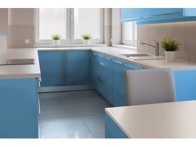 Bodaq S186 Glacier ist eine robuste, 210 µm starke, verformbare Interiorfolie in eleganter Unicolor-Optik mit fühlbarer Haptik, mit der man durch Upcycling nicht nur die Umwelt schont, sondern auch Kosten spart, Zeit reduziert und nebenbei optische Akzente in Hotellerie, Gastronomie, Shops, Ladenbau oder Wohnräumen setzt. Bereits vorhandene natürliche Rohstoffe, wie z. B. Türen, Fenster, Fensterbänke, Fliesen, Treppen, Möbel usw., können umweltschonend wiederverwertet werden und schonen unsere Wälder und vermeiden Müll. Die PVC-Folie ist in mehreren Schichten aufgebaut und mit einem positionierbaren Luftkanalklebstoff für blasen- und faltenfreie Verklebungen ausgestattet. Der Schutzfilm auf der Folienoberfläche ist wasserresistent, schmutzabweisend, temperaturbeständig, strapazierfähig und pflegeleicht mit hoher Resistenz gegen viele Flüssigkeiten. Außerdem wirkt er antibakteriell und reduziert die Ansiedlung und Vermehrung von Mikroorganismen, was in Nassräumen ein besonders erwünschter Effekt ist. Die Folie ist frei von Phthalaten (Weichmachern) und schädlichen Schwermetallen, wie Blei oder Quecksilber, und wird mithilfe erneuerbarer Energien hergestellt. Von Beginn der Produktion bis zum fertigen Produkt sind alle CO² Emissionen erfasst und kontrolliert. Die Folie besitzt ein Brandschutzzertifikat B1 nach DIN 4102-1.