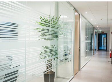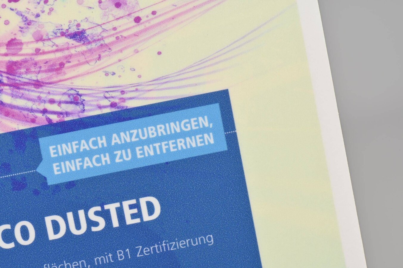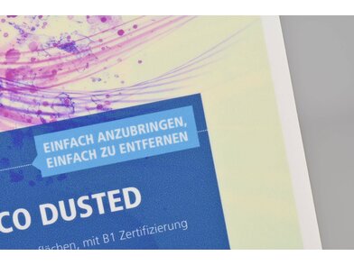 solvoprint® glass deco dusted von Neschen ist eine transluzent milchweiße, polymer weichgemachte, selbstklebende Folie für flache Untergründe. Mit ihr kann der Effekt von Milchglas kostengünstig nachgestellt werden. Der umweltfreundliche wasserbasierte permanente Kleber mit Mikrokanälen sorgt für eine einfache Applikation der Folie, da beim Verkleben entstandene Blasen leicht rausgestrichen werden können. Die Folie lässt sich ausgezeichnet mit Latex-, Eco-Solvent-, Solvent- und UV-härtenden Tinten bedrucken und kann geplottet werden. Die Folie ist ideal für Innenanwendungen in Form von Beschriftungen und Dekorationen. Sie kann aber auch vor Wasser geschützt im Außenbereich angebracht werden. Die Verklebung kann beispielsweise auf Spiegeln, Fenstern und Glaswänden erfolgen. Des Weiteren ist sie abwaschbar und bestandsfähig gegen einige Löse- und Reinigungsmittel. Der Brandschutz ist nach DIN 4102 (B1) und die Antibakterielle Wirkung nach ISO 22196 zertifiziert.