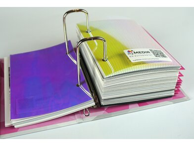 Unter dem Motto „Alles in einer Hand“ wurde großer Wert auf Kompaktheit und Übersichtlichkeit gelegt. 10 Register unterteilen mehr als 150 Produkte nach Themenbereichen. Die Muster im Format DIN A6 können herausgenommen werden und sind mit einem individuellen QR Code ausgestattet, unter dem rund um die Uhr Produktinfos, Datenblätter, Anleitungen, Zertifikate usw. abrufbar sind.