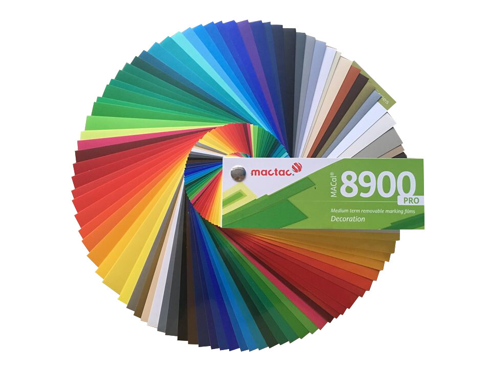 Der Farbfächer 8900 Pro von Mactac zeigt ein umfangreiches Sortiment an premium Folien in einem handlichen Fächer. Er bietet die Möglichkeit verschiedenste Originalmuster von Mactac auf einem Blick betrachten zu können. Die Auswahl des Kunden wird mit ihm vereinfacht und er dient als besondere Verkaufsunterstützung, da die Farben und Oberflächen der Folien genau betrachtet werden können.